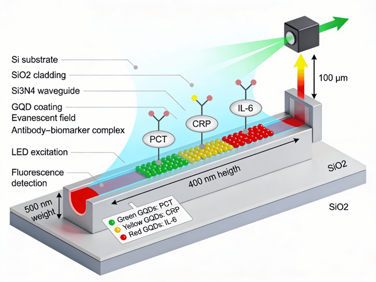 By integrating photonic sensing with fluorescence-based signal modulation, this work enables sensitive, multiplexed biomarker detection from small blood volumes. Quantum-enabled simulations performed on the IBM Quantum runtime were used to model and measure sensor performance using shot-based simulations (2,000 measurements per condition) of biomarker-dependent fluorescence quenching and photonic wavelength shifts at clinically relevant concentrations. These simulations allowed dose-response analysis, estimate of limit-of-detection and comparison with the known neonatal clinical decision thresholds.